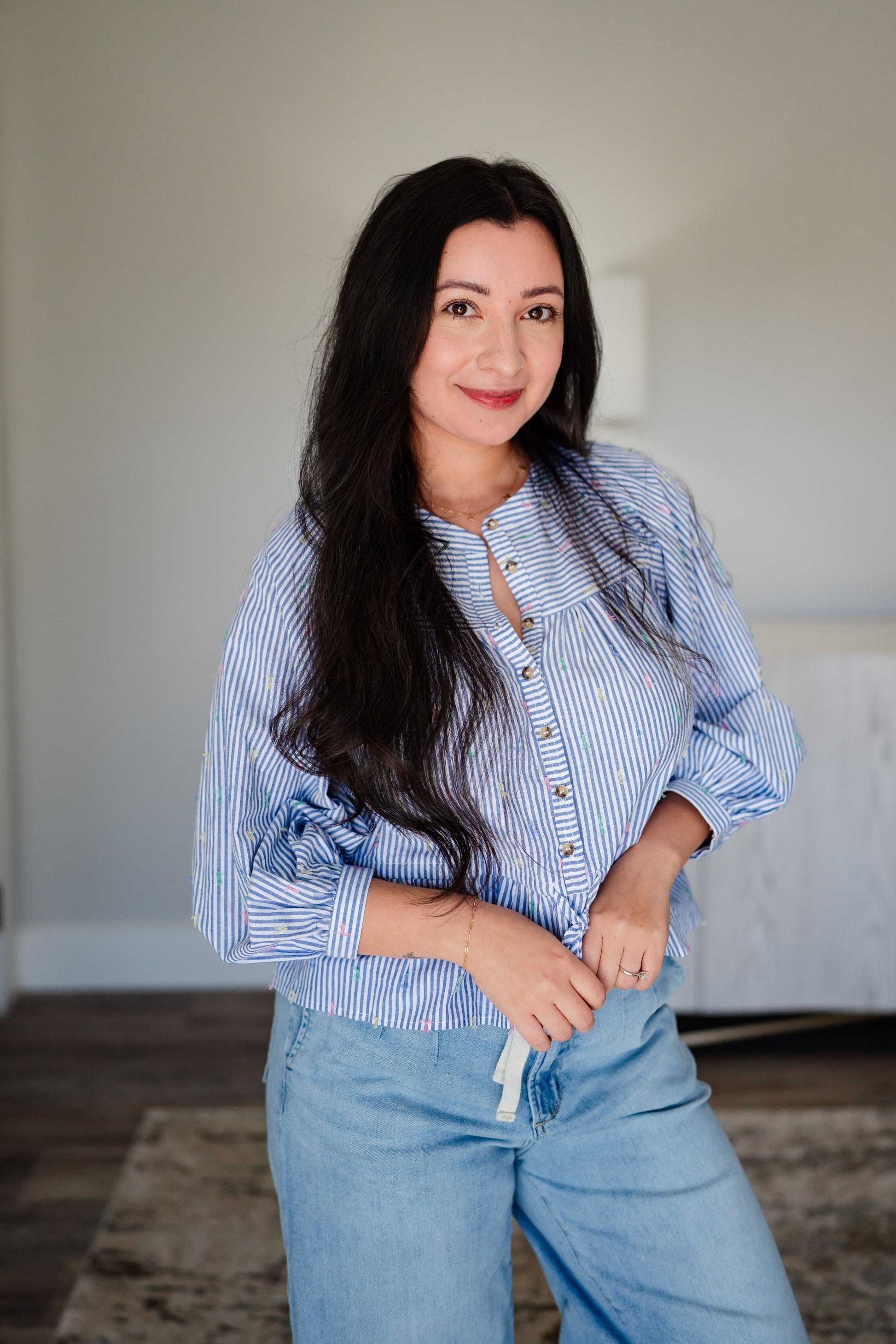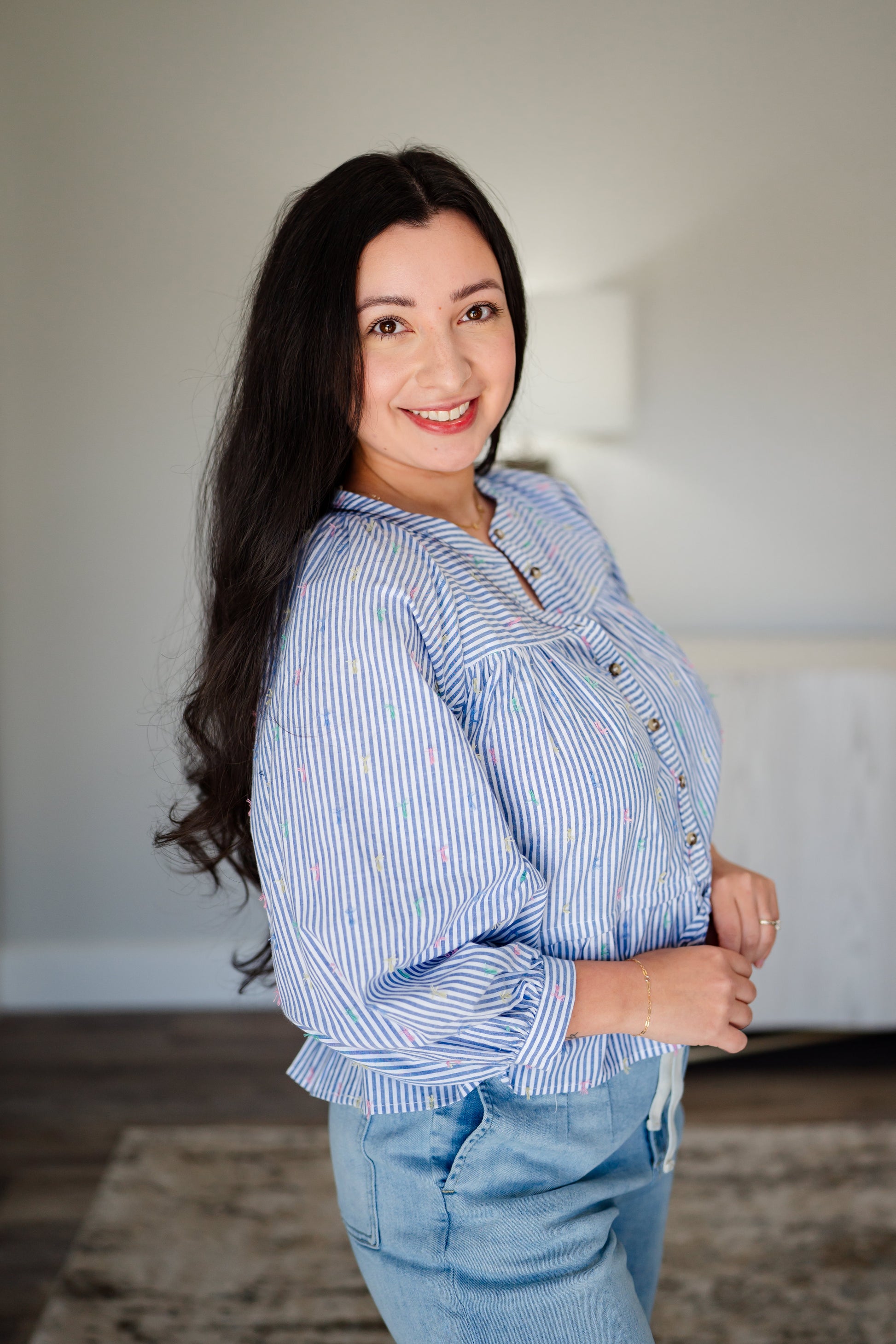 - Alejandra is 5’3’’ and wears a medium top and size (4)27 in pants. She is shown wearing a small in the top.