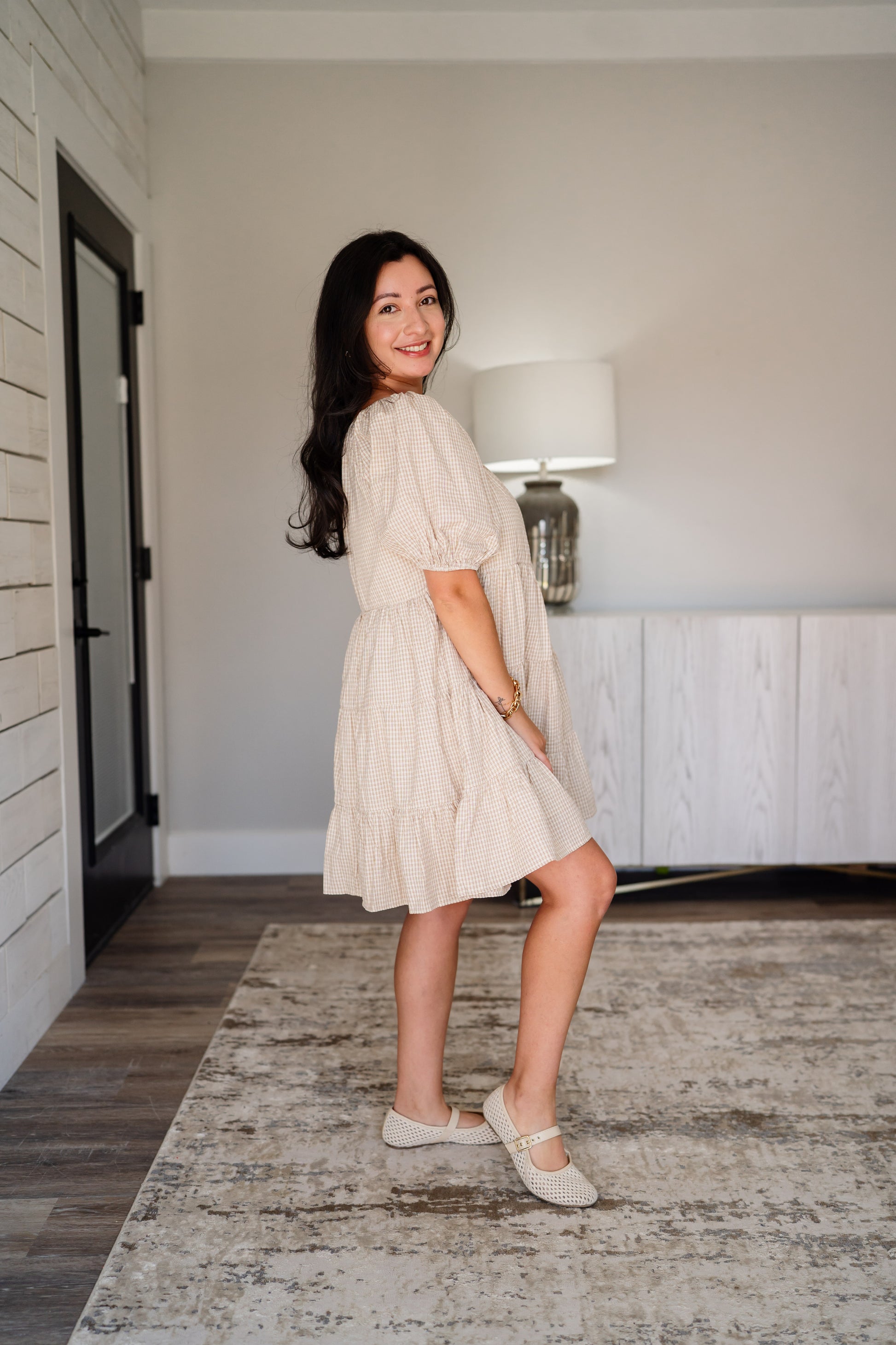 Gingham Puff Sleeve Tiered Dress - Ivory/Mocha
