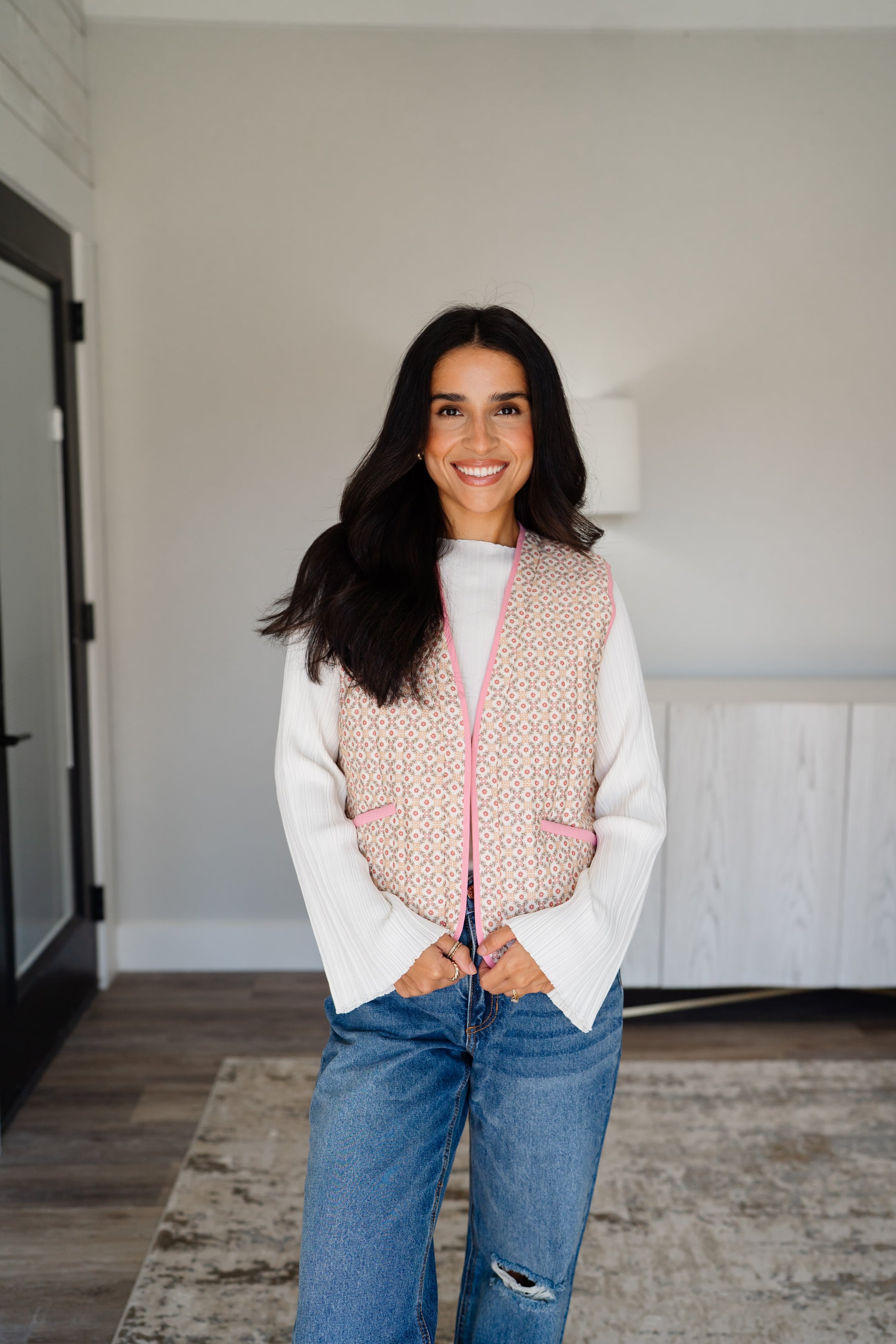 - Ashley is 5'4" and wears a small top and size 0(25) in pants. She is shown wearing a size small in the vest.