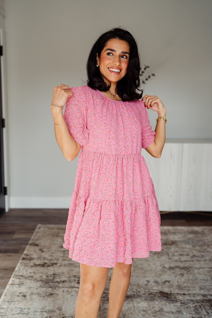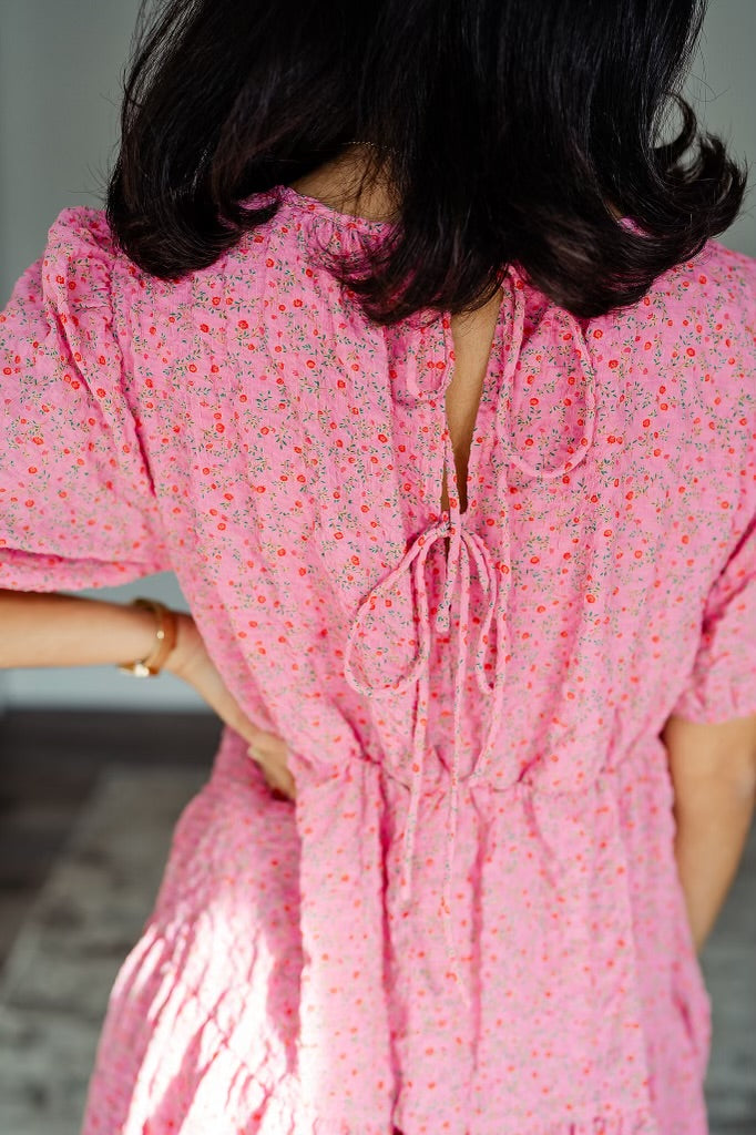 - Ashley is 5'3", wears a small top and a size 0(25) in pants. She is shown wearing a size small in the Textured Tiered Pink Floral Dress.